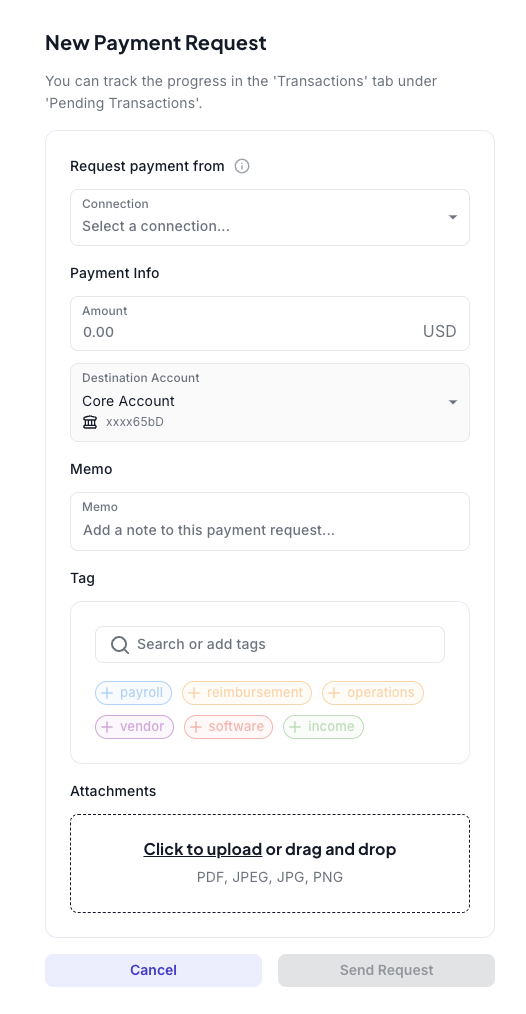 When creating a payment request, add the account into which you would like to receive funds as the Destination Account and optionally add a memo, tag, and attachments.