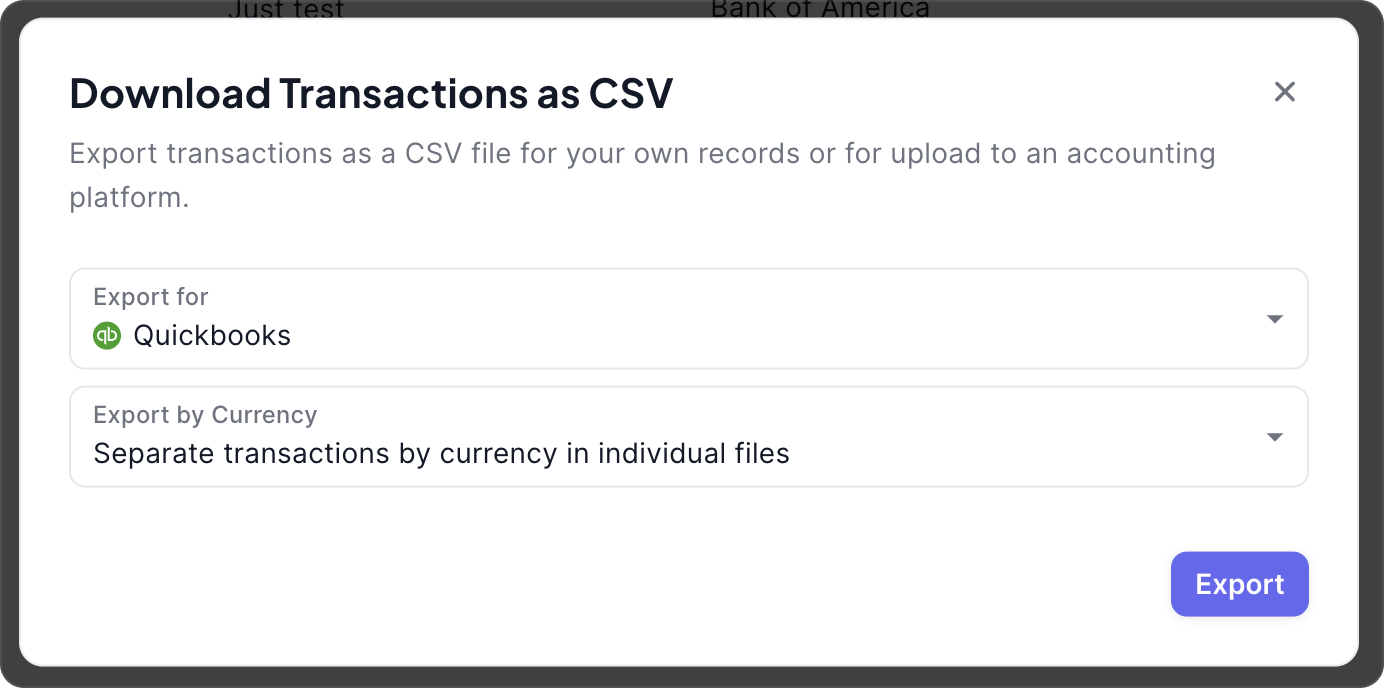 Click on the Download icon to export the filtered transactions. Select the accounting software you want to export for and how you'd like the file to be prepared. Click Export to download the CSV files.