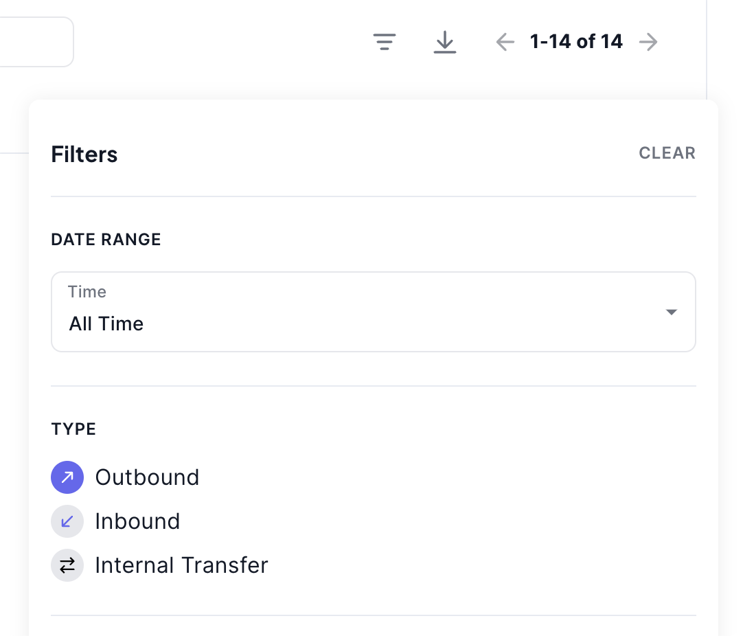 Go to the Transactions tab and click on the Filter icon to select the time range or other criteria to filter the transaction records to your needs.