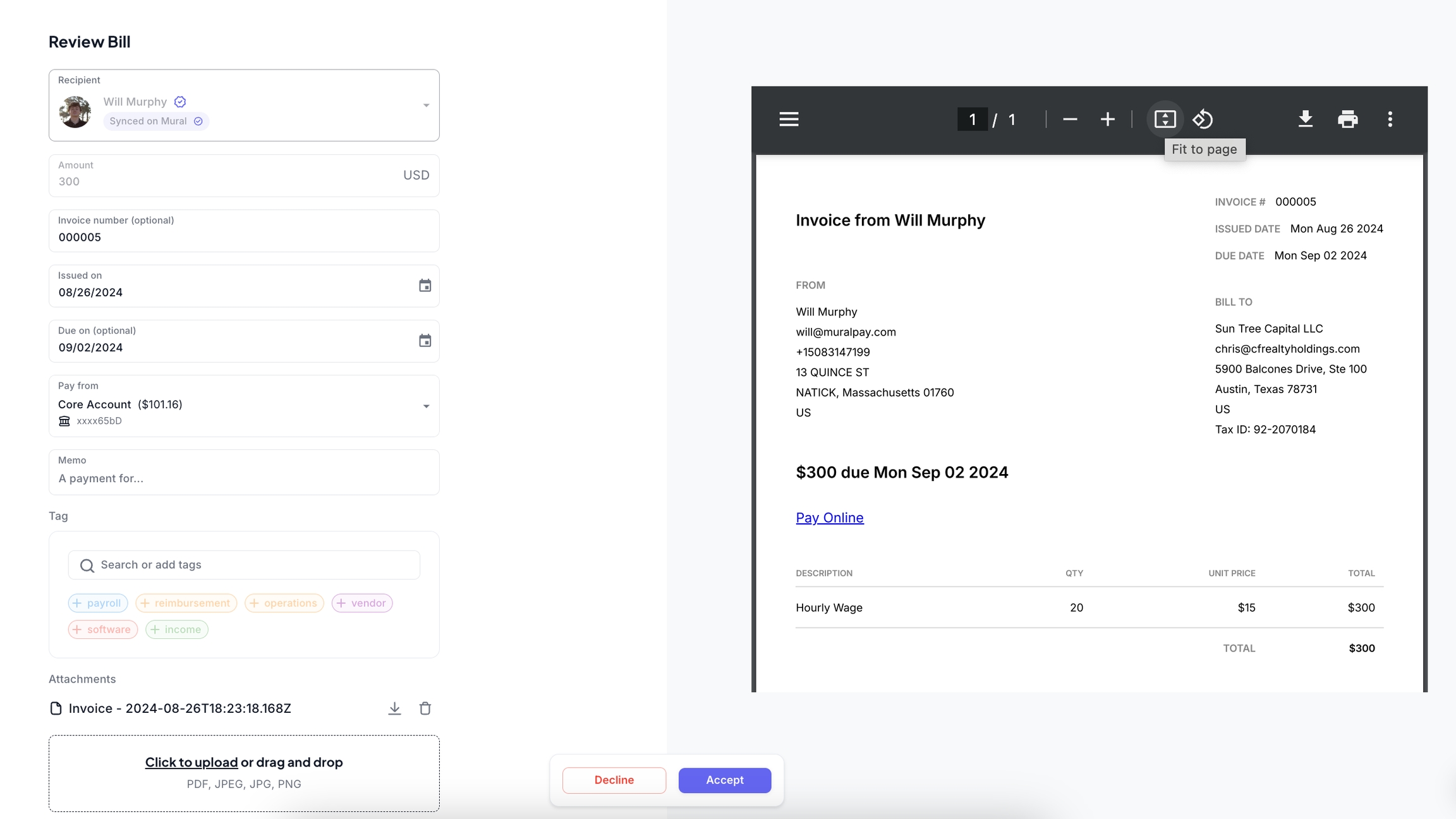 If accepting the bill, you should select the Pay From account as the Mural account with which you ultimately intend to pay the bill.