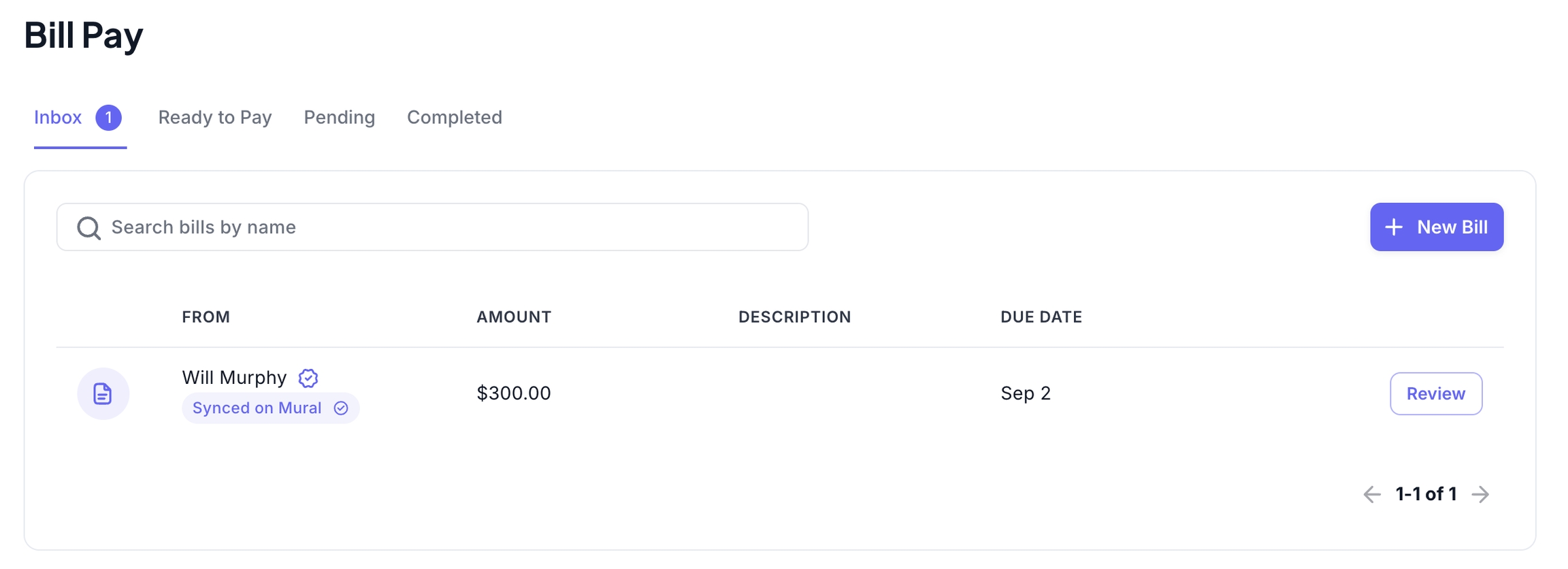 You can review and manage bills you have received or uploaded. Newly received and newly uploaded bills will populate your Bill Pay Inbox.