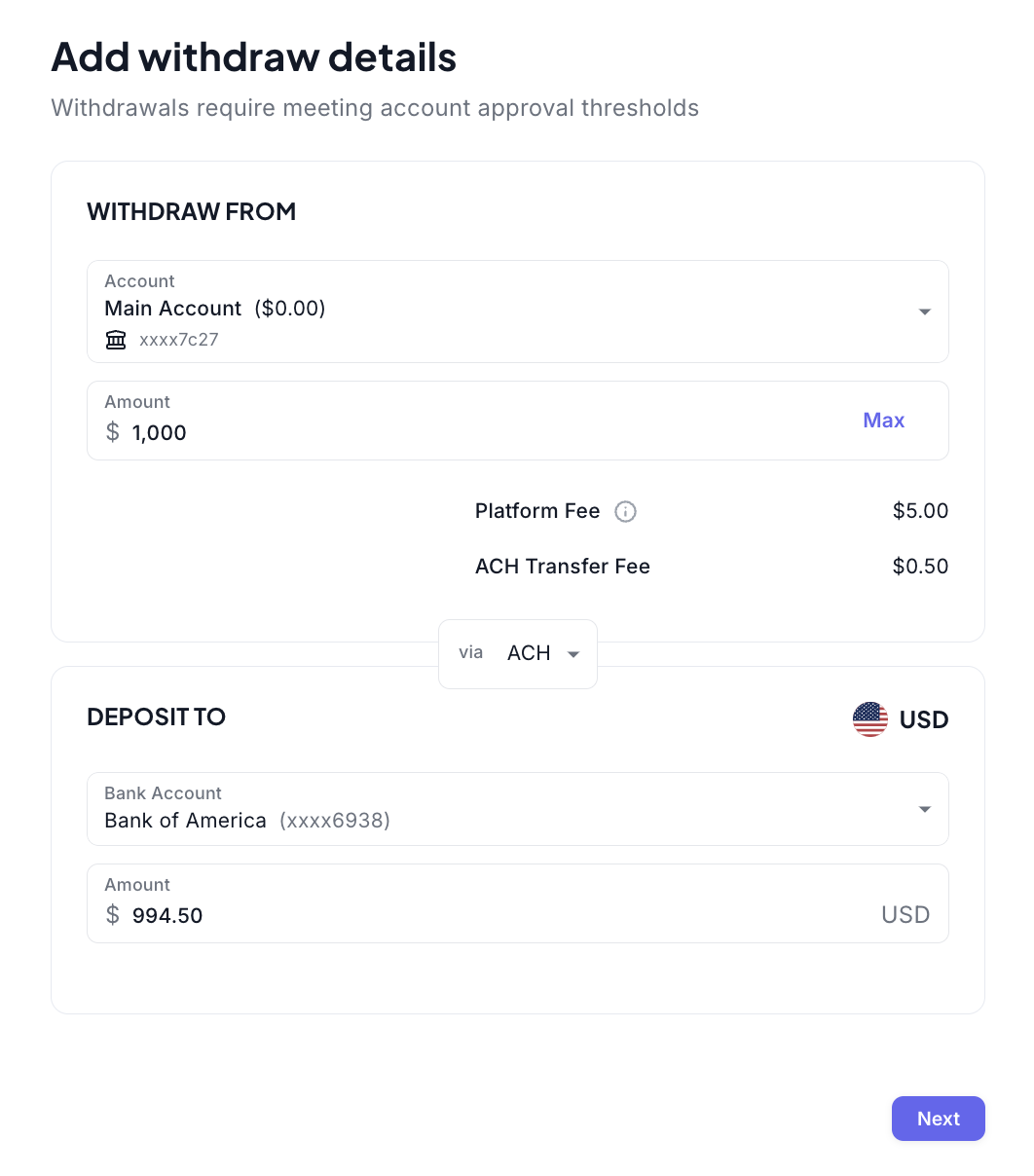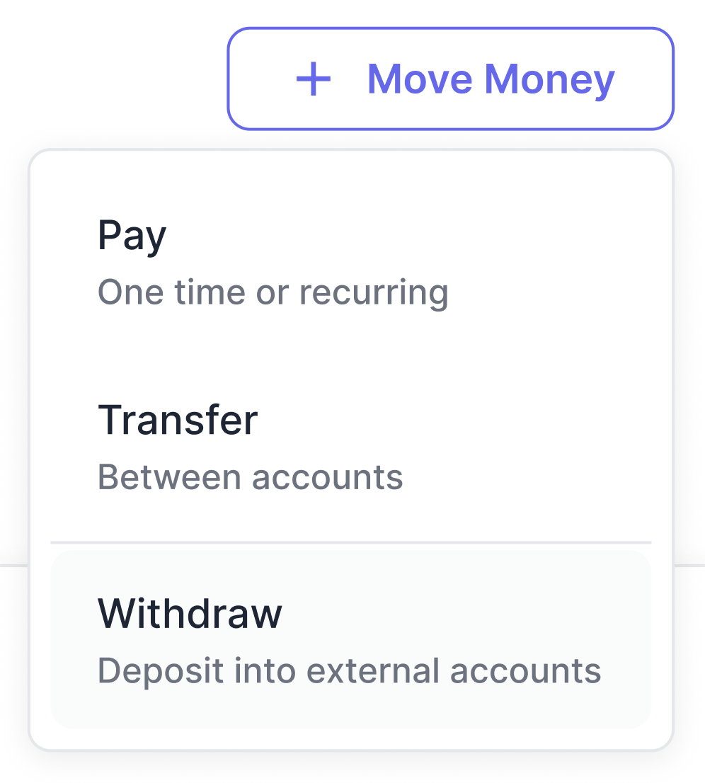 Access the withdraw flow under the Move Money button in the top navigation, or from within a specific Account.