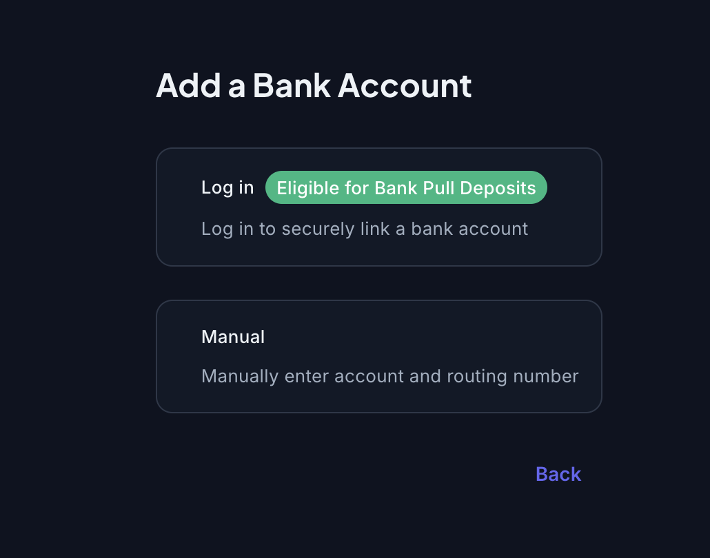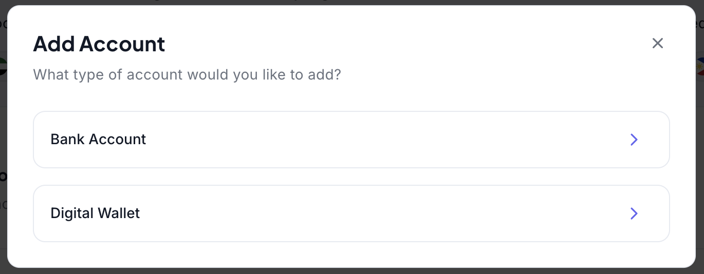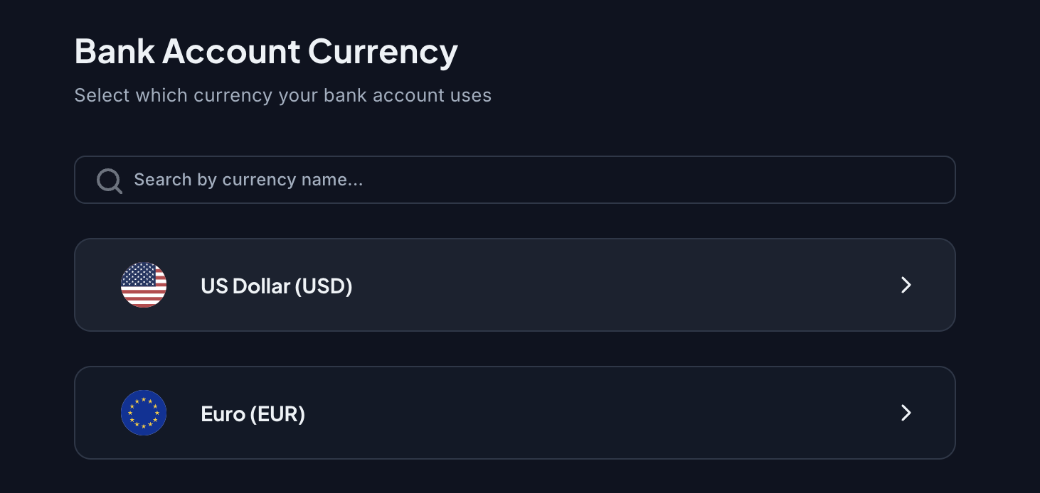 Select the currency that your bank account supports. Depending on the selected currency, we support adding bank accounts via Plaid or Manual Linking.
