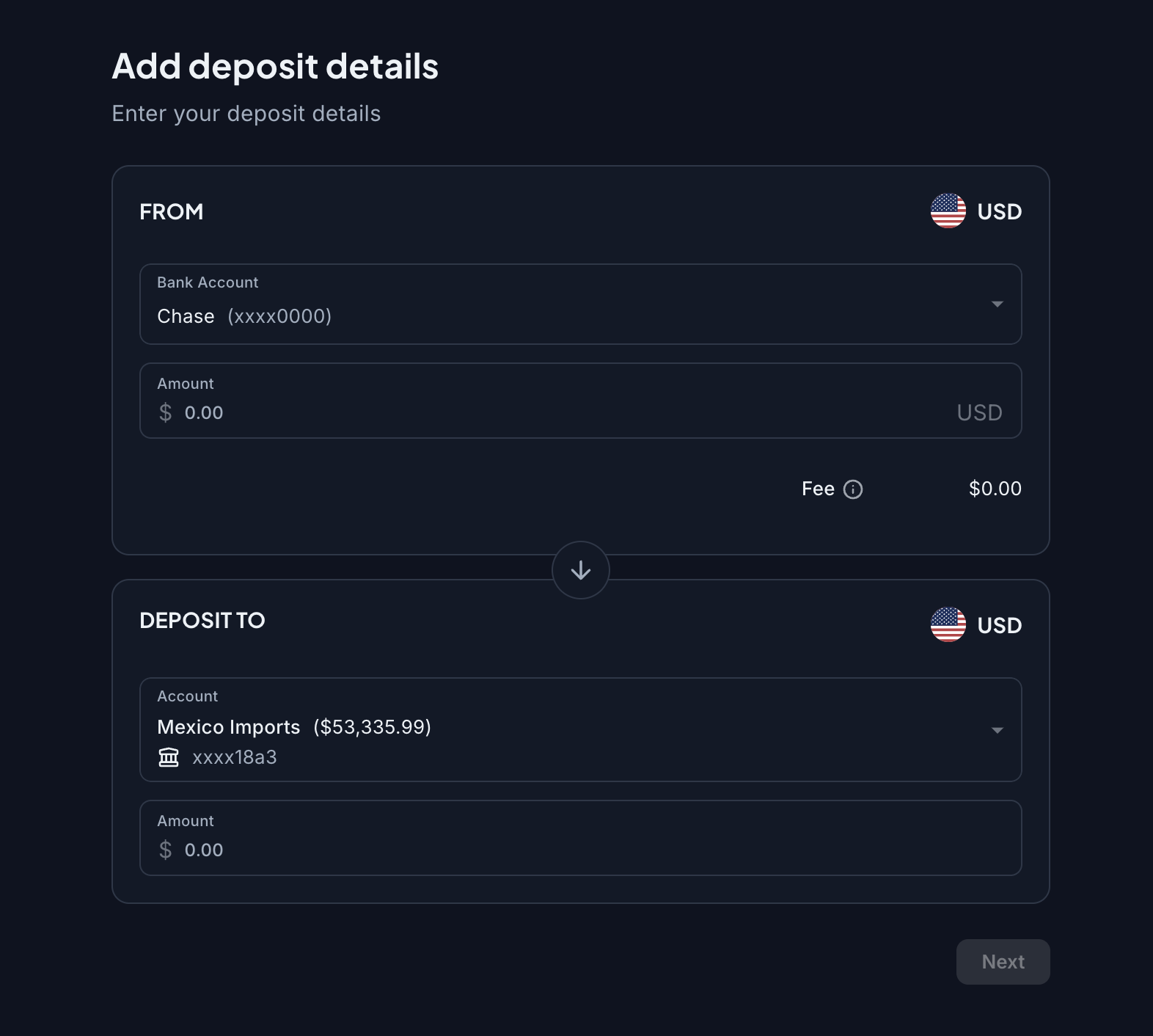 Step 5 - Now, you will be able to deposit funds by pulling funds from bank. Please ensure that you select the bank account you have just connected via Plaid when going through the deposit flow under the "FROM" section: