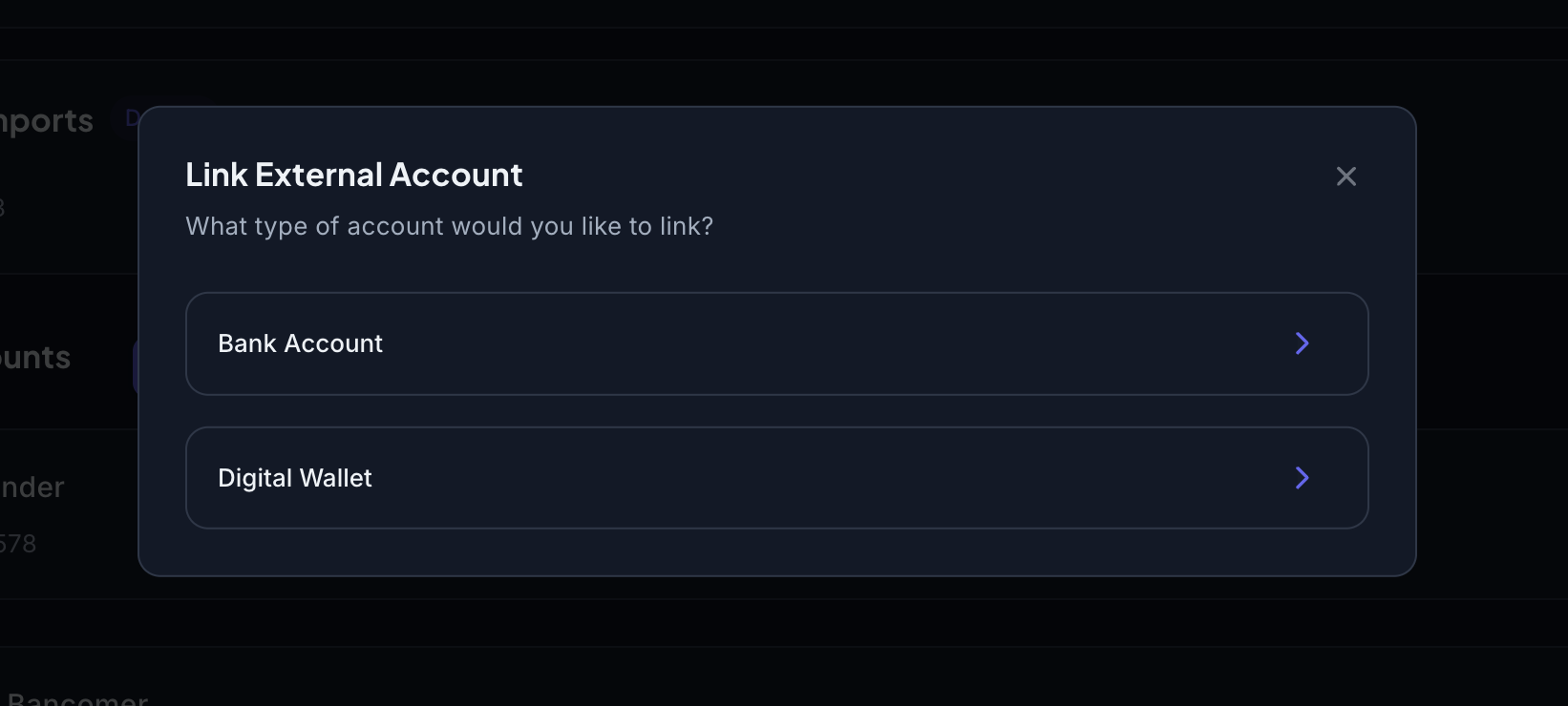 Bank account linking for fiat operations is supported for bank accounts from our supported currencies list. You can also connect and withdraw funds to an external digital wallet (e.g. exchange account, digital wallet, etc.)